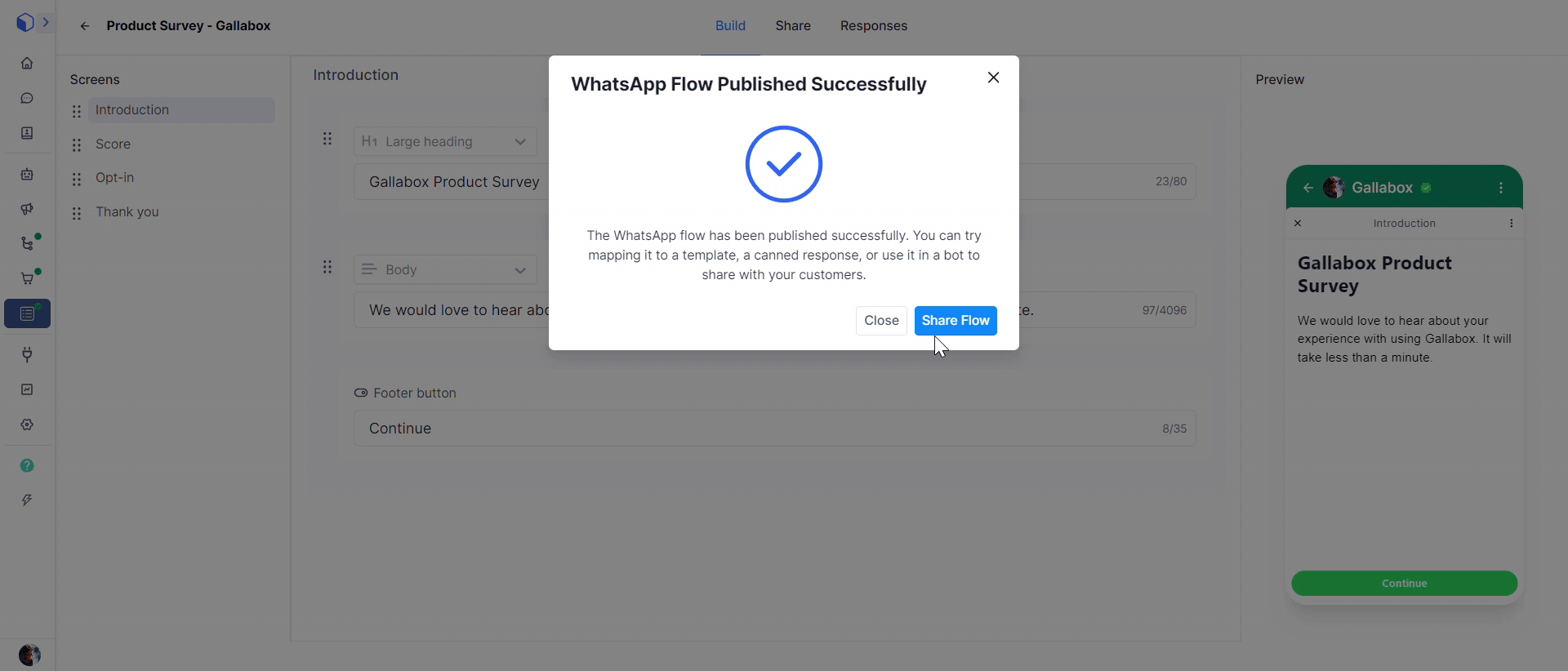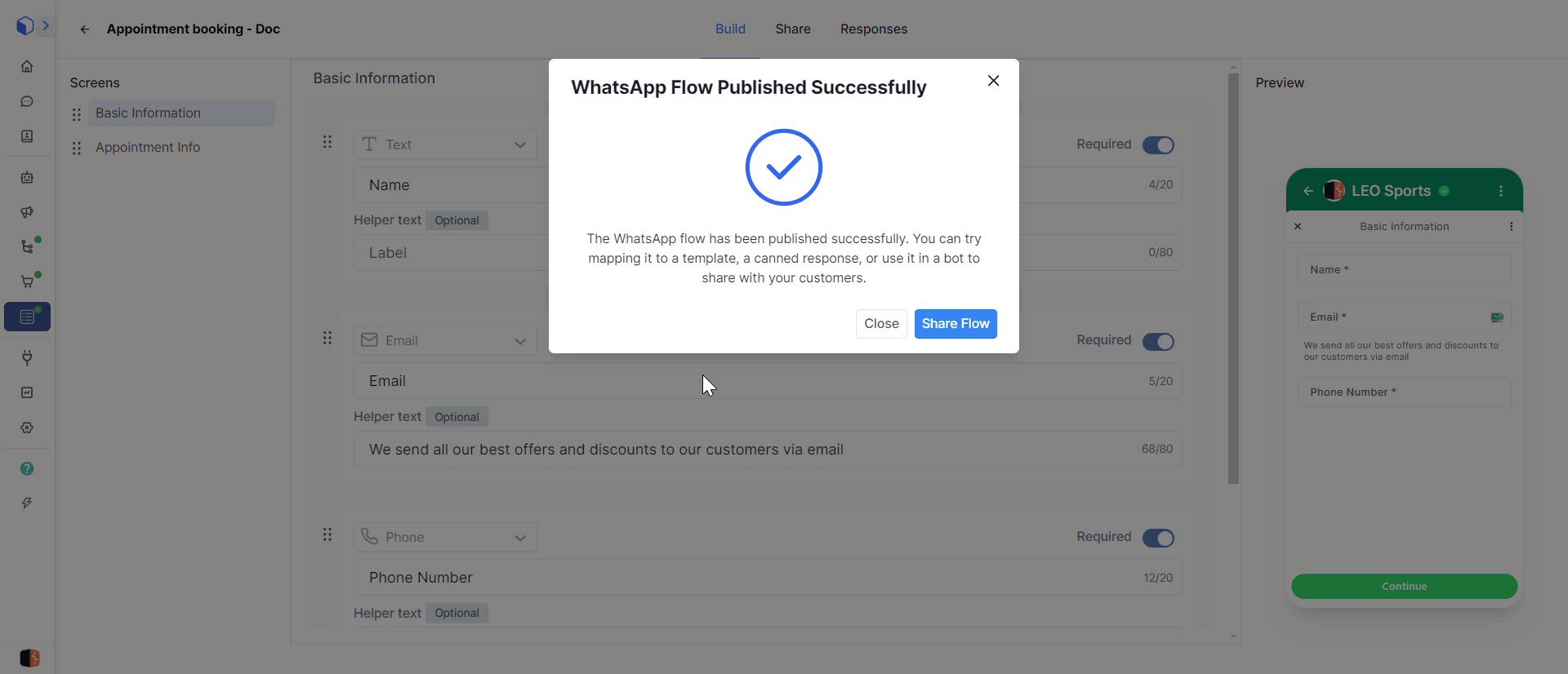 6. Published Flow can be shared via a Message Template or as a Canned Response or via Bot.&#x20;