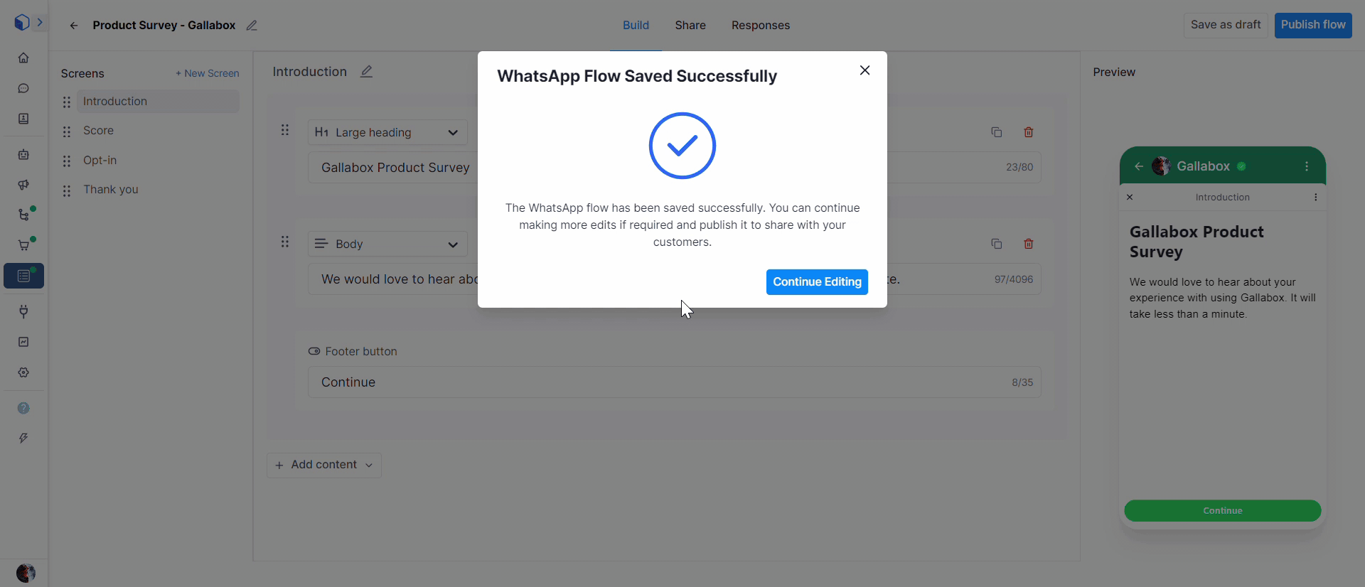 4. Your WhatsApp Flow Template draft will be saved. You can edit it again if needed. This will serve as the final revision before publishing.
