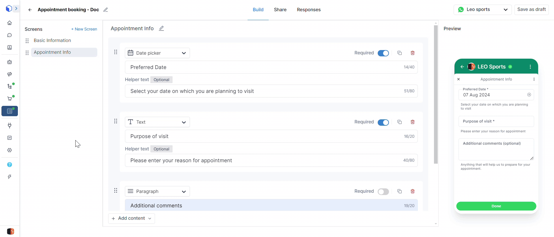 You can add upto 100 screens to a WhatsApp Flow. Each screen can include: