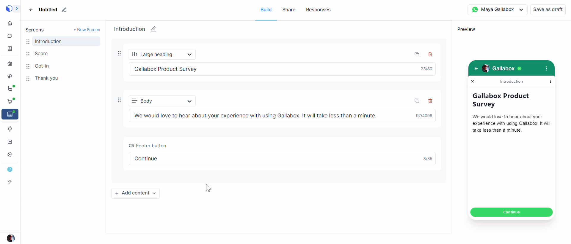 3. Once you are done adding the relevant components in your WhatsApp Flow, click on 'Save as draft' button on the right side of the window. It will save your current draft.&#x20;