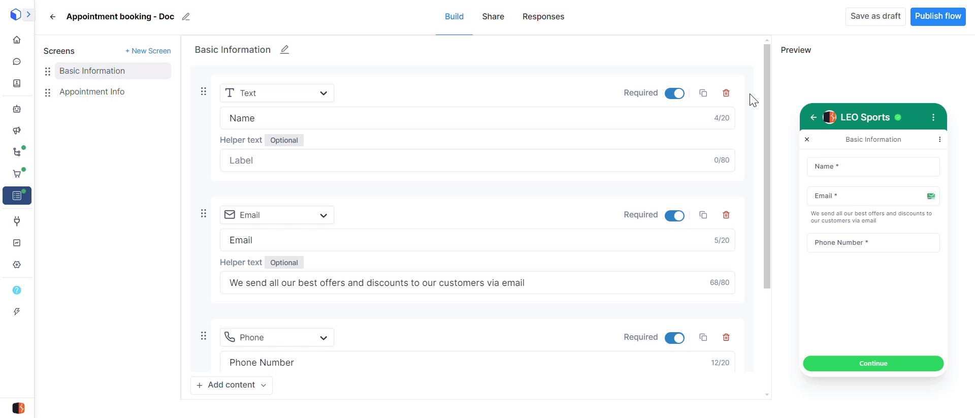 5. To publish the draft of your WhatsApp Flow, click on Publish flow button on the right side of the window.&#x20;