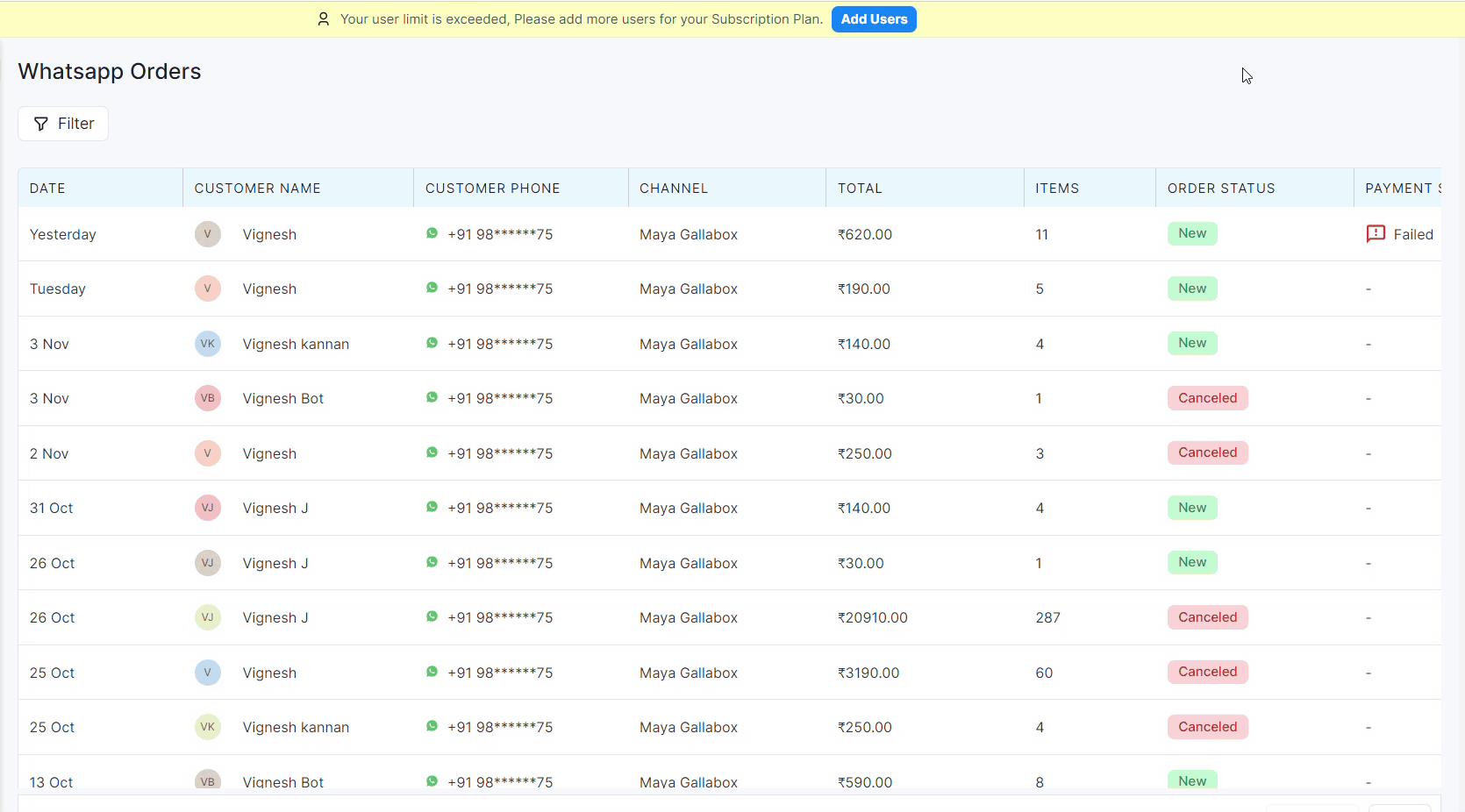 Accessing and managing WhatsApp Orders in Gallabox is a straightforward process. Navigate to the WhatsApp Orders section, where you can view, update, filter and track orders seamlessly. The intuitive interface ensures a user-friendly experience for both order management and analysis.