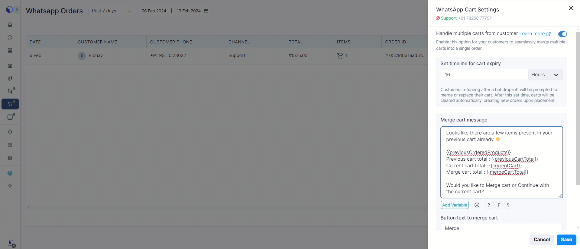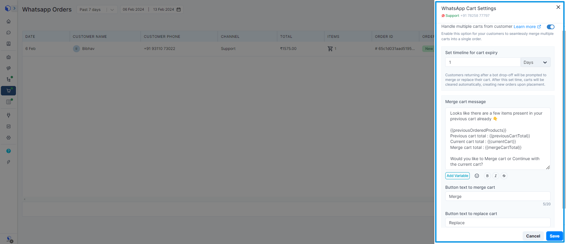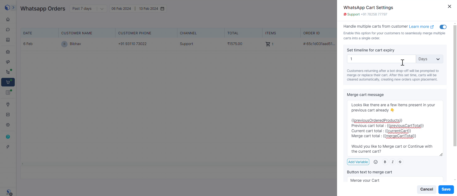 With WhatsApp Cart Settings, you can merge all the scattered carts into one neat order, ensuring you customer never miss out on anything they wanted to buy. You can set a timeframe for the carts to expire, keeping the shopping experience organized and clutter-free.