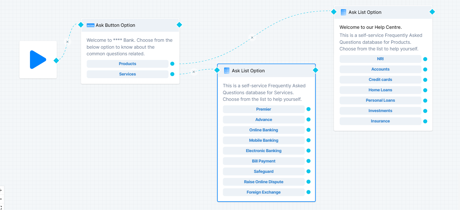 Below is the **sample flow** for your reference. You can create a thorough self-service FAQ bot.&#x20;