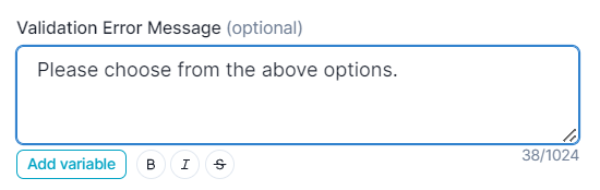 <figure><img src="https://3137140735-files.gitbook.io/~/files/v0/b/gitbook-x-prod.appspot.com/o/spaces%2FZcl3T6ePz95GpzjAeOLW%2Fuploads%2FiYmeRmQlexgTnyvgu67x%2FAsk_list_option_Validation_error_message.png?alt=media&#x26;token=6bec5fec-1477-4d0f-b954-056423bf1b2f" alt=""><figcaption></figcaption></figure>
