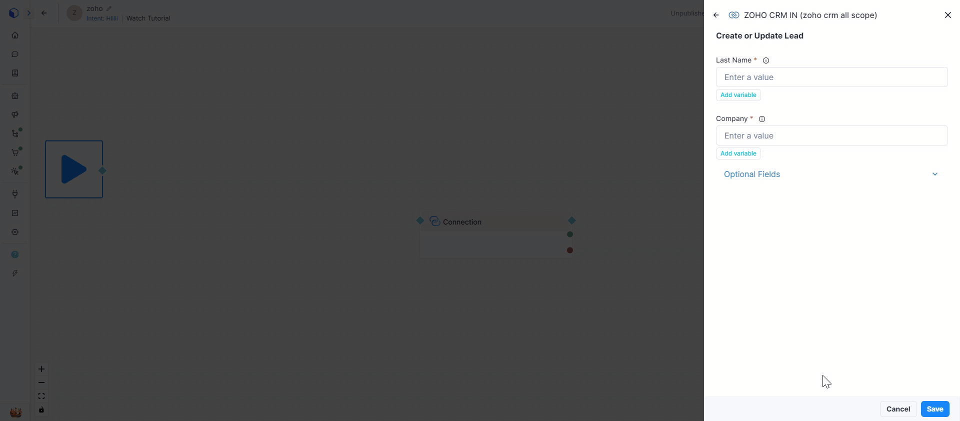 With your Zoho CRM connector configured, effortlessly manage leads and dynamic modules. Follow the steps outlined in this guide to ensure accurate data input, whether it's creating or updating leads, creating one lead, or working with dynamic modules. Optimize your Zoho integration by adding the right variables and values, making your chat-flow a powerful asset for efficient customer relationship management.