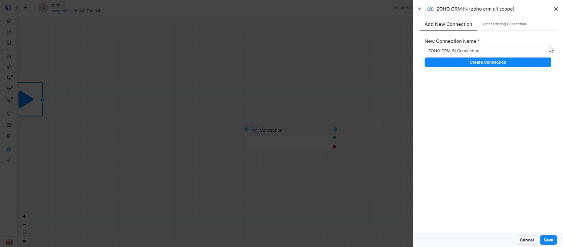 <figure><img src="https://3137140735-files.gitbook.io/~/files/v0/b/gitbook-x-prod.appspot.com/o/spaces%2FZcl3T6ePz95GpzjAeOLW%2Fuploads%2FqsSk5LrP5s8xJcY7uMj9%2Fzoho_Connector.gif?alt=media&#x26;token=a9053df4-aaa3-45d5-86b9-82ec2dd72b23" alt=""><figcaption></figcaption></figure>