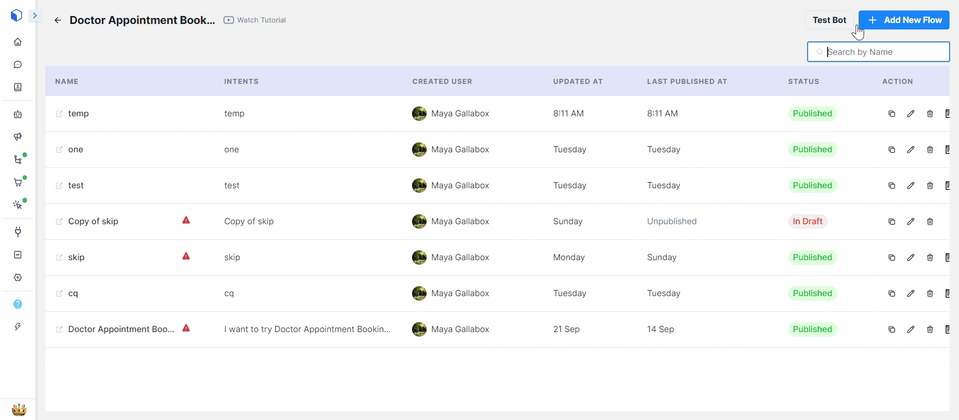 2. Click on "**Add New Flow**" at the top right corner as shown in the GIF below. You will be prompted to provide the **Flow name**, [**Flow type**](#what-is-flow), **Intents** (Keywords). Click on create once you enter the details.&#x20;